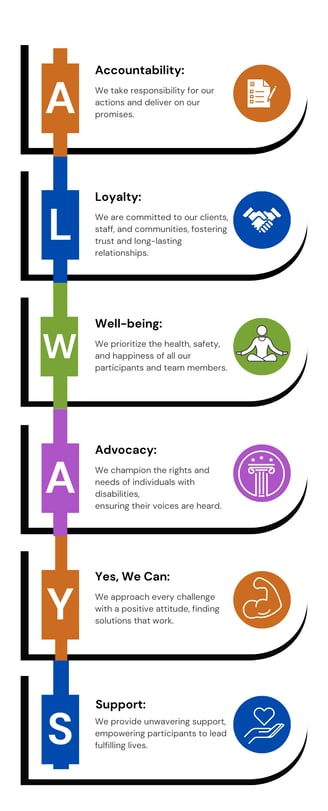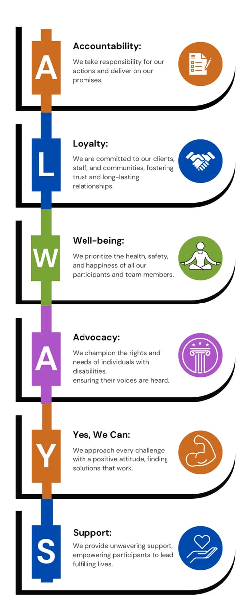 Guided by the principles of "ALWAYS," we embrace Accountability by standing behind our actions and fulfilling our promises. Our Loyalty to clients, staff, and communities builds trust and enduring relationships. We place the highest priority on the Well-being of everyone we serve, ensuring their safety, happiness, and quality of life. Advocacy is central to our mission, as we work tirelessly to amplify the voices and rights of individuals with disabilities. With a "Yes, We Can" approach, we face every challenge with positivity and determination, finding innovative solutions that make a difference. And through unwavering Support, we empower participants to live their lives to the fullest.